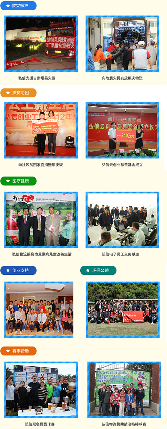 富有使命感,勇于承擔社會責任,是弘信企業(yè)價值觀的重要組成部分。在企業(yè)發(fā)展壯大的同時,弘信始終懷著高度的社會責任感,關注民生和社會發(fā)展,多形式積極回饋社會。除無償宣導和分享創(chuàng)業(yè)經驗外,公司也積極投身社會公益事業(yè),不斷加大救災賑災和扶貧濟困力度。關愛愛滋兒童,關注生態(tài)綠色環(huán)保,支持贊助運動賽事,連續(xù)多年組織員工義務獻血等等,2013年聯(lián)合廈門市慈善總會,投入240萬元發(fā)起設立弘信云創(chuàng)業(yè)慈善基金,資助貧困高考學子圓夢大學。弘信以實際行動努力踐行自己的社會擔當,并將力圖為社會、為公眾做出更多貢獻。